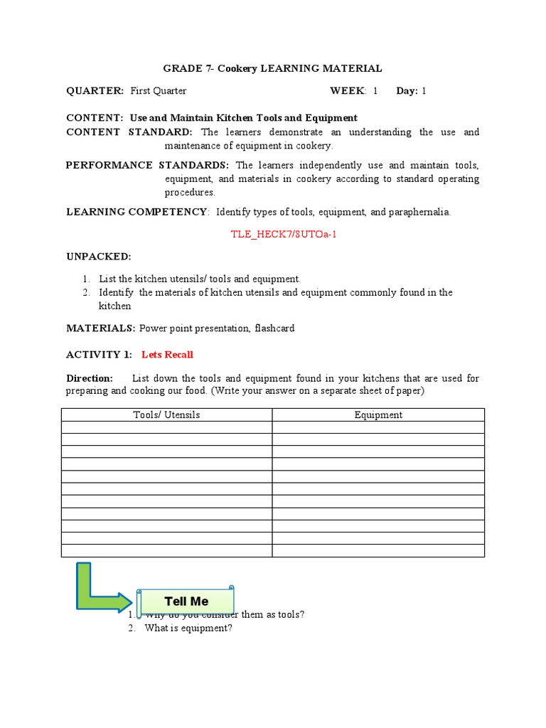 Trial lesson in caregiving 7 introduction to caregiving tools, equipment, and paraphernalia in taking vital signs equipment kitchen tools. Maintenance of kitchen tools, equipment, and paraphernalia perform mensuration and calculations interpret kitchen layout.